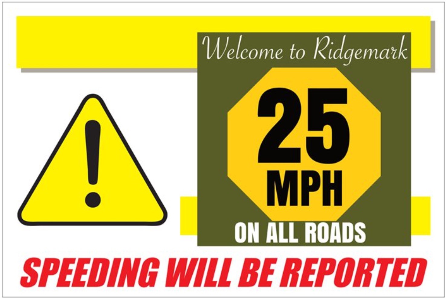 As the Ridgemark XI HOA Board, our job is to listen to the concerns of our members and follow up with positive solutions. This Speeding Awareness Campaign is a response to the continued complaints about speeding we receive from our members and this speed awareness program is a reasonable solution aside from placing speed humps on all of our roads. Because of this we ask for our members support in continuing this positive solution. We know that many speeders are visitors or service businesses driving through our neighborhood and we want our 25 mph speed limit visible to all those who are either not aware or disrespecting of the posted speed limit.