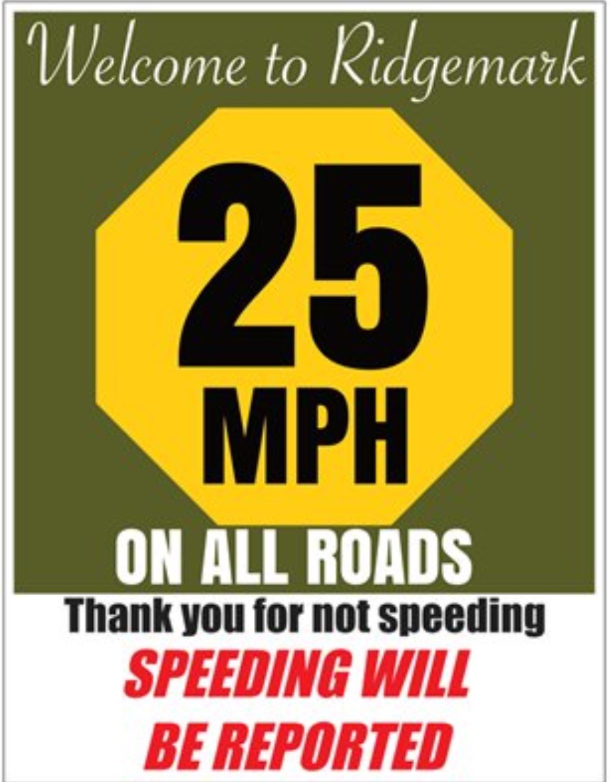 Also, if you are renting or leasing your home, you have the responsibility of notifying the occupants of the 25 MPH speed limit in Ridgemark. We have had reports of speeders going to homes that are leased. If your home is rented, it is your responsibility to make the occupants aware of the speed awareness program because they are not on our distribution list. Or, you can provide the board with their names and email addresses so we can add them to the distribution list.