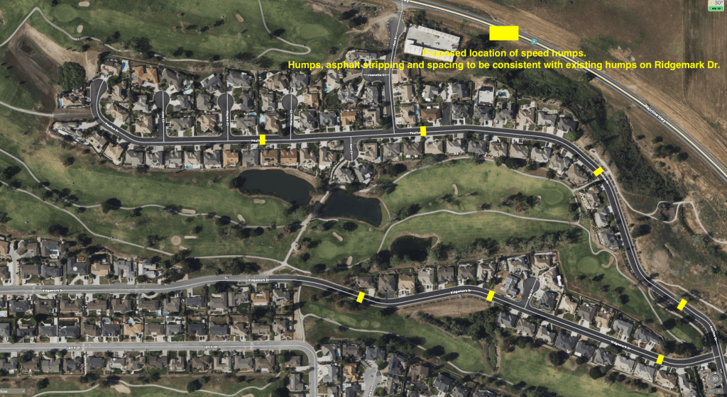 The purpose of the meeting was to present to the Homeowner Association plans for the installation of “Speed Humps” and allow for discussion. Copies of a detailed map identifying potential location for seven (7) speed humps was made available for viewing. The dimensions of the speed humps will be 4-1/2 inches tall, 12.0 feet wide, and extend approximately 38 feet across the width of the street. Chevrons and identifying wording will be painted on the speed humps. See attached map with proposed locations of speed humps.