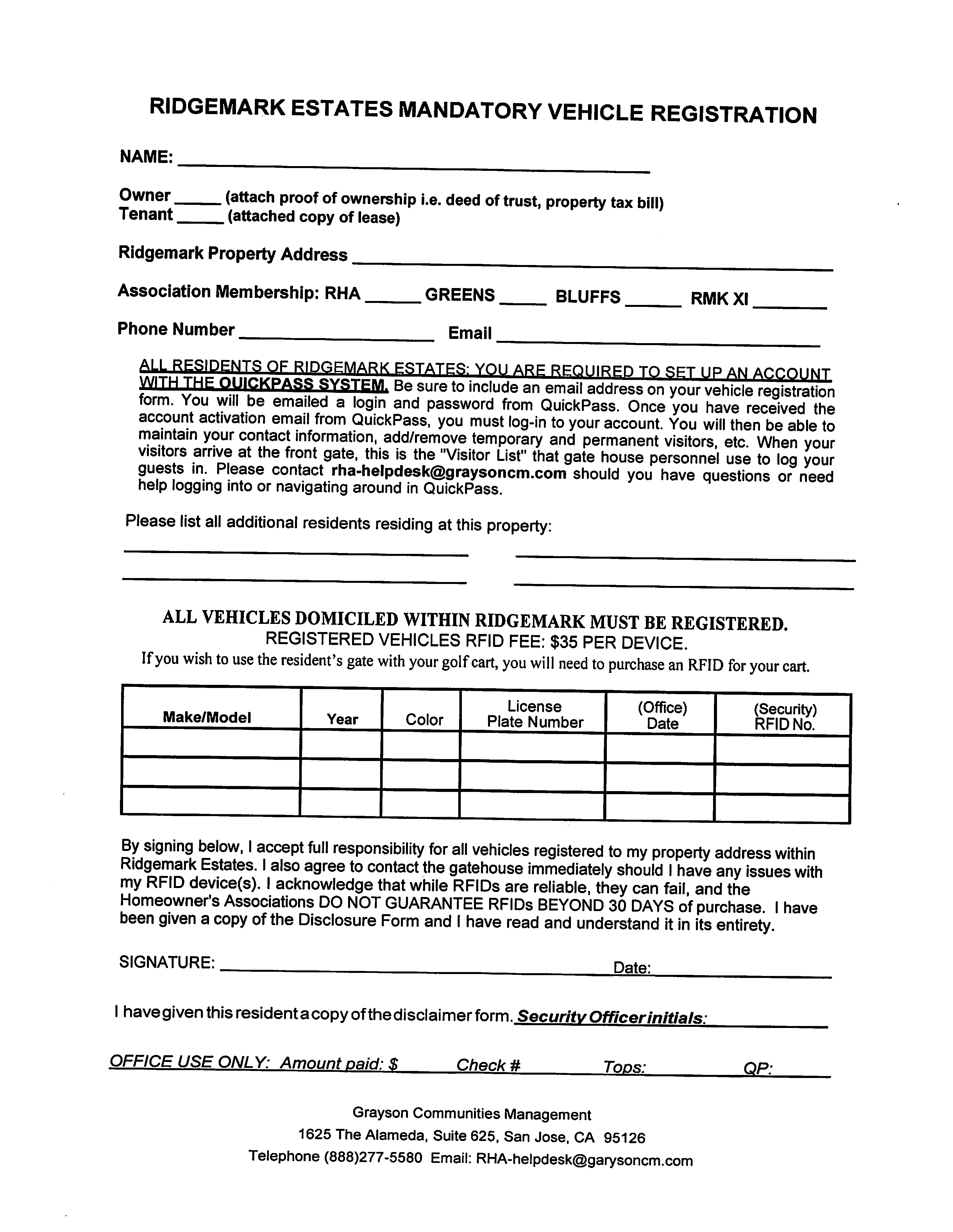 Below is the Ridgemark Estates Mandatory Vehicle Registration form: